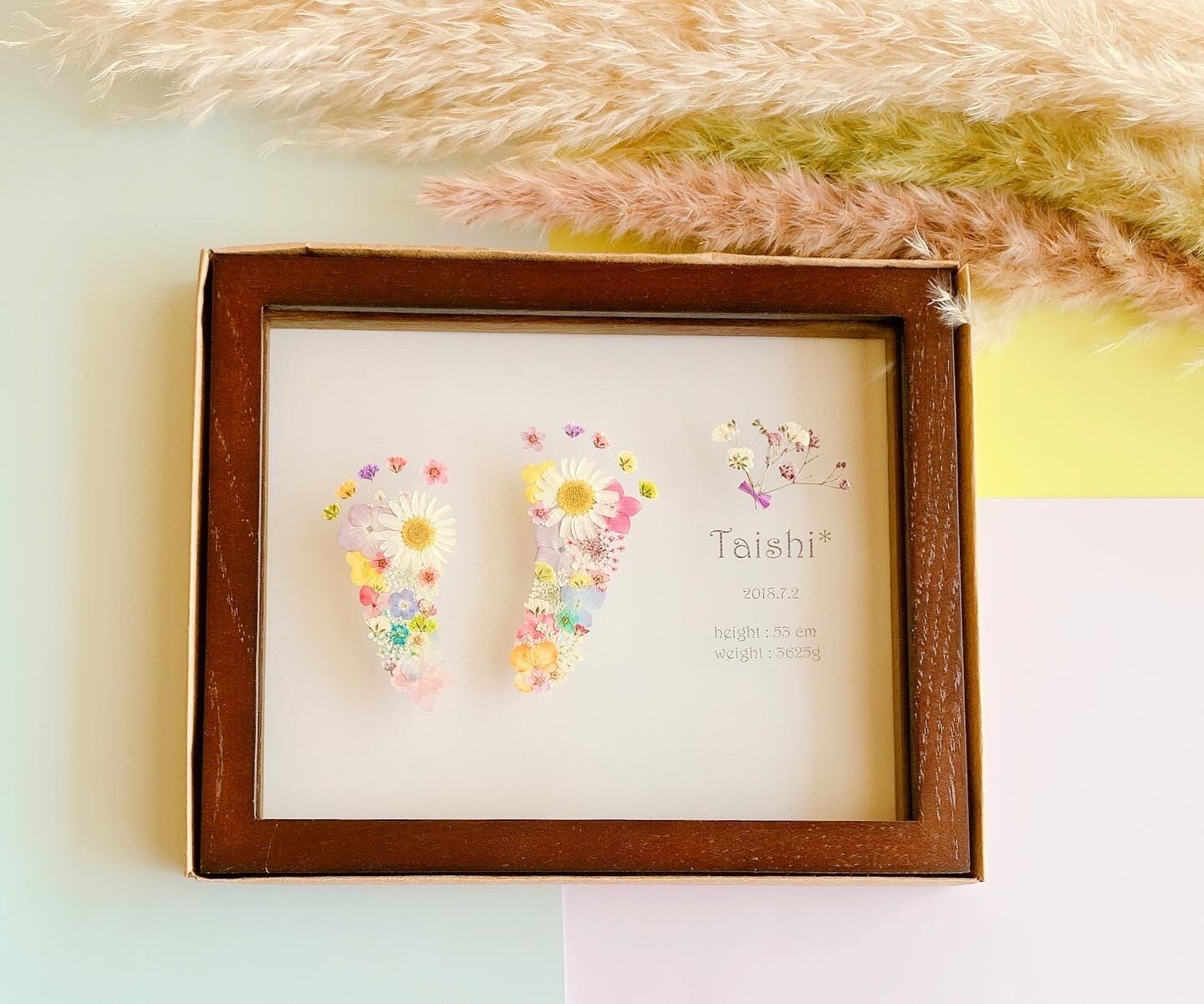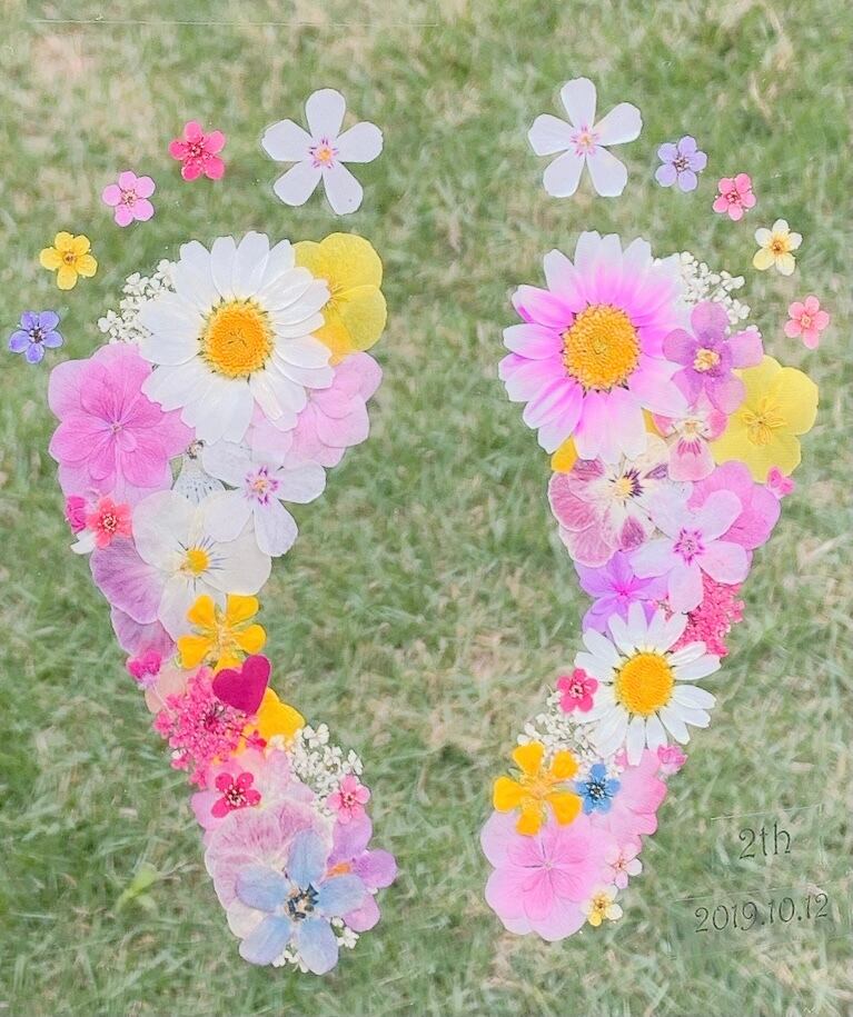 足形フラワーアートは本物のお花を使用しております。お花の色は、ゆるやかに変化(褪色)していきます。日が経つにつれて、アンティークな風合いにかわっていく姿も楽しんでもらえればと思います。ご理解いただいた上、ご注文いただける様、よろしくお願い致します。